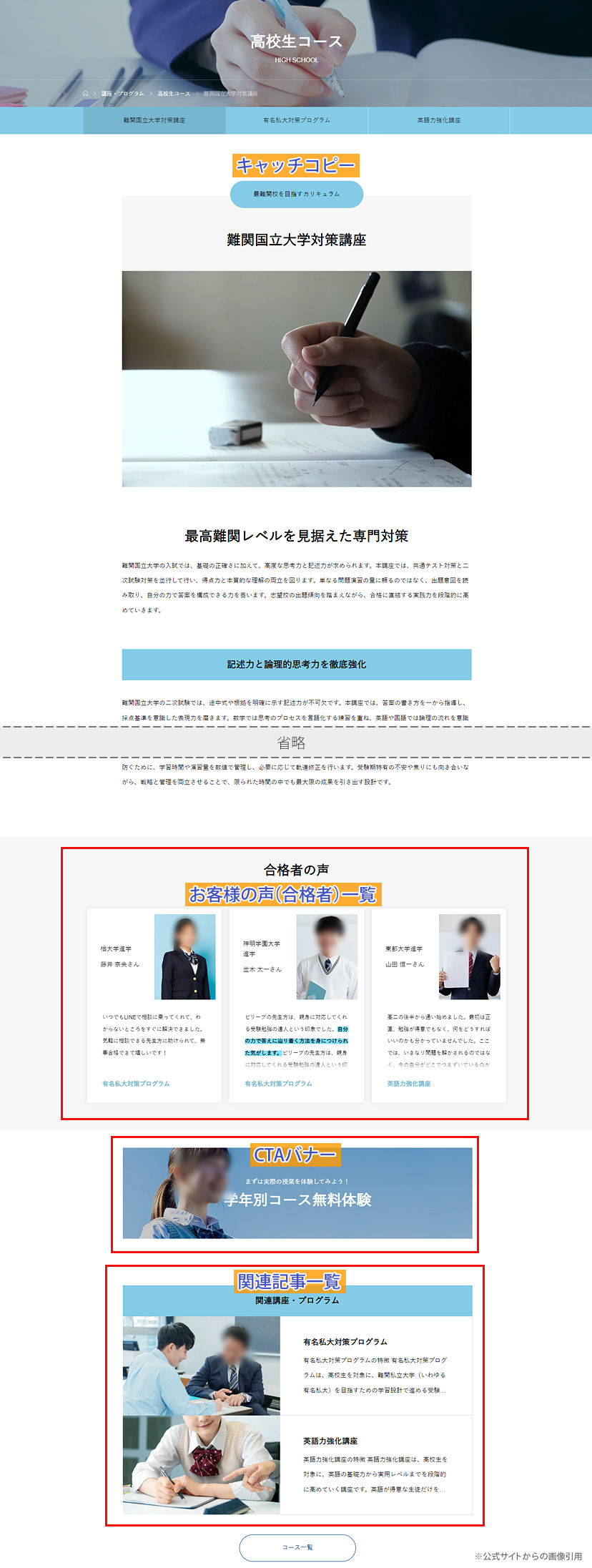 コース紹介/講座一覧/講師紹介/お客様の声/よくある質問/ランディングページなど、塾/学校サイトに求められるページ構成はほぼほぼ網羅してます。